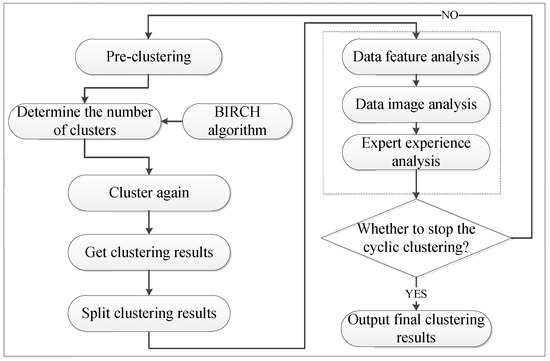 After one cycle of clustering, the classifications with obvious features are separated, but the obtained clustering results are not detailed enough. In this paper, a cyclic two-step clustering method is innovatively proposed, in which the obtained clustering results are further clustered in detail. The results of previously unknown types of abnormal conditions are thus further divided. The CTSC method is shown in Figure 2. The criteria for stopping the cycle include image analysis of the data, feature analysis of the data, and expert experience analysis, where the feature analysis of the data includes minimum value, maximum value, range, variance, mean, and standard deviation. When the stop rule is met, the clustering stops and the final clustering result is output. Otherwise, the cycle continues clustering.