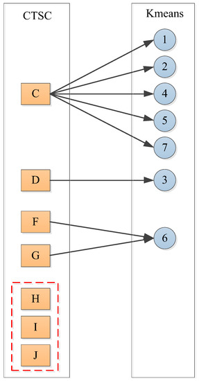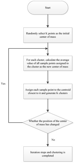 The Kmeans clustering algorithm is one of the commonly used clustering algorithms, which has the characteristics of simplicity, scalability, and so on. It is generally applied in many fields such as pattern identification, image processing, artificial intelligence, and bioengineering. The calculation process [7] of this clustering algorithm is shown in Figure 4. The observed objects are initially classified, and then adjusted to get the final classification. In this paper, the Kmeans clustering method is compared with the innovative CTSC method to illustrate the advantages of the CTSC method.