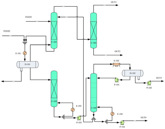 Figure 6 shows the flow chart of the absorption stabilization system of the catalytic cracking unit. The system includes absorption tower C-101, desorption tower C-103, reabsorption tower C-102, stabilization tower C-104, and so on. The crude gasoline and high-pressure rich gas in the previous process are separated into dry gas, liquefied gas, stabilized gasoline, and other products. FEED1 is crude gasoline and FEED2 is high-pressure rich gas. OUT1 represents dry gas, OUT2 represents rich absorption oil, OUT3 represents liquefied gas, and OUT4 represents stable gasoline.