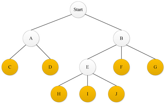 The resulting eight variables were clustered using the cyclic two-step clustering method. The tree diagram of the clustering results is shown in Figure 8. In the first clustering step, two clustering results were obtained, which were Class B and Class A. Class B and Class A satisfied the criteria to continue cyclic clustering, so the tree continued to grow. Class A was clustered by the two-step clustering method again, resulting in classes C and D. Class C and Class D did not satisfy the criteria to continue cyclic clustering and stopped growing. Class B was clustered by the two-step clustering method, resulting in classes E, F, and G. Class F and Class G did not satisfy the criteria to continue cyclic clustering and stop growing. Class E satisfy the continuous cycle clustering criteria and continued to grow. Class E was clustered by the two-step clustering method, resulting in Class H, Class I, and Class J. Class J, Class I, and Class H did not satisfy the criteria to continue cyclic clustering and stopped growing. The final clustering resulted in seven classes, which were Class J, Class I, Class H, Class G, Class F, Class D, and Class C.