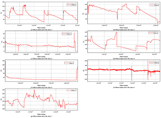 The observation curves of T1 in the CTSC classes are shown in Figure 9. It can be seen that the cyclic two-step clustering achieved good clustering results. From Table 3 and Table 4, Figure 9, and the overall changes in T1 data, combined with expert analysis and numerical analysis, Class F and Class G were normal operating conditions. Class C was an abnormal operating condition due to the startup and shutdown of the device. Class D was an abnormal operating condition caused by meter damage and meter calibration. Class H, Class I, and Class J were three kinds of abnormal operating conditions caused by other reasons.