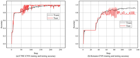 For comparison, Figure 12a,b shows the identification accuracy of CTSC-CNN and Kmeans-CNN, respectively. The accuracy rate of the CTSC-CNN model on test set finally reaches 99.0%, while the Kmeans-CNN model only reaches 76.0%. Compared with the Kmeans-CNN model, the CTSC-CNN model has higher identification accuracy, and the accuracy fluctuation during model training was smaller. The test set and training set-based results of the CTSC-CNN model had almost the same trend (rising smoothly with the increase of the number of iterations), proving the stability of the CTSC-CNN learner.