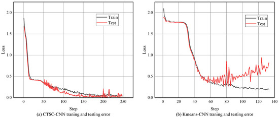 The CNN-based learning process in this paper included the mean square error loss function. Figure 13a,b shows the identification errors of CTSC-CNN and Kmeans-CNN, respectively. The final error of the CTSC-CNN model on test set was 0.04, while the final error of the Kmeans-CNN model on test set was 0.82. Compared with the Kmeans-CNN model, the error of the CTSC-CNN model decreased faster with the iteration, and was smaller and more stable in the later stage of the training process. At about 50 times, the learning efficiency of CTSC-CNN began to decline. After that, the error gradually stabilized.