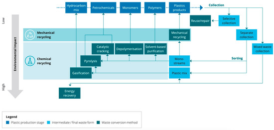 Plastics recycling technologies and their environmental impact. Reproduced with permission from Kerkhoven, et al. [40]: “Pathways towards circular plastics: Point of view”, published by Deloitte Belgium, 2021.