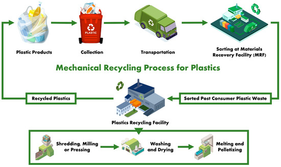 Mechanical recycling refers to processing plastic waste (or recyclates) into secondary raw materials or products without significantly changing the material’s chemical structure [39]. Mechanical recycling optimizes the utilization of plastic resources [41,42] and has the least negative environmental impacts compared to other waste treatment methods [40,43]. It is also simple and straightforward to execute and effective in treating most thermoplastics [38,44,45]. Clear polyethylene terephthalate (PET), low-density polyethylene (LDPE), high-density polyethylene (HDPE), and polypropylene (PP) are the primary feedstocks and products of mechanical recycling globally [37,43]. Modern mechanical recycling is the most established and widespread plastic recycling method, accounting for almost all recycled [43,46,47,48]. Figure 3 illustrates a modern mechanical recycling process for plastic waste.
