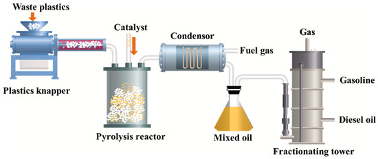 Flowchart of plastic waste pyrolysis process. Reproduced with permission from Maqsood, et al. [112]: “Pyrolysis of plastic species: A review of resources and products”, published by Elsevier B.V, 2021.