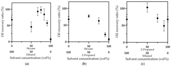Effect of solvent mixture composition on the oil recovery ratio. (a) Hexane/ethanol mixture, (b) hexane/2-propanol mixture, and (c) 2-propanol/ethanol mixture.