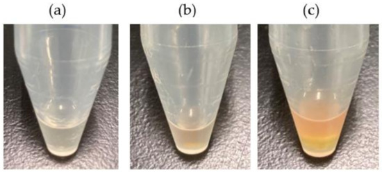 Pictures of oils extracted by each pure organic solvent after nonwoven filtration. (a) Hexane, (b) ethanol, (c) 2-propanol. The extracted oils were heated at approximately 60 °C.