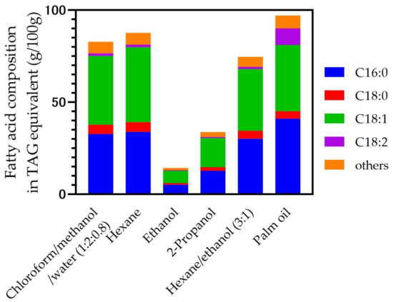 The fatty acid composition (change in physical properties) is affected the extraction method [10,25]. Therefore, the fatty acid composition and amount of TAG by the sum of TAG equivalents from fatty acids in oils extracted using various solvents are plotted in Figure 5. The fatty acid compositions of the oils extracted using pure hexane and a 3:1 (v/v) hexane/ethanol mixture were similar to those of palm oil, although the compositions in the cases of pure ethanol and 2-propanol were different. Therefore, it can be deduced that many non-target fat-soluble components were extracted using ethanol and 2-propanol. These results also indicate the usefulness of the 3:1 (v/v) hexane/ethanol mixture as an extraction solvent. The Bligh and Dyer system consisted of a chloroform:methanol:water (1:2:0.8) mixture.