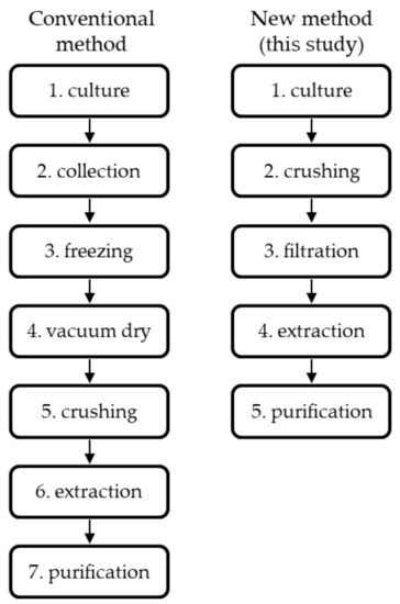 Recently, many palm oil-related companies have begun promoting sustainable palm oil sourcing, which is environmentally friendly, considers labor and human rights issues, and procures Roundtable on Sustainable Palm Oil (RSPO)-certified palm oil that can be traced throughout the entire supply chain from oil palm farms to products [4]. However, the risks associated with environmental destruction and climate change have not been fundamentally solved; therefore, alternative oils that can replace palm oil are required. Oleaginous yeasts are advantageous producers that can accumulate oil, whose major component is triacylglycerides (TAG), up to approximately 60% of their dry cell mass [5,6]. The oils produced by Lipomyces starkeyi (hereafter referred to as yeast oil) are similar in fatty acid composition (rich in palmitic acid and oleic acid) and physical properties (solid at room temperature) to palm oil; therefore, it is expected to be an alternative palm oil from the viewpoint of flexible manufacturing locations and sustainability because there will be no need to harvest forests [7,8,9,10]. In addition, Lipomyces starkeyi has great industrial potential as an excellent lipid producer because it is a suitable host for genetic engineering to improve lipid production [11]. However, the preparation of yeast oil remains at the research level, using reagents in media and organic solvents that are not recognized as edible. We tried to utilize edible materials and processes, and we succeeded in producing yeast oil as an edible alternative to palm oil [12]. The proposed yeast oil production process includes (1) culturing, (2) cell recovery, (3) freezing, (4) vacuum drying, (5) cell crushing, (6) organic solvent extraction, and (7) oil purification [12,13]. In the cell recovery and lyophilization (freezing and vacuum drying) methods, the yeast cells can be crushed efficiently, and the oil can be recovered with organic solvents in high yields due to the low water content, though they are particularly time-consuming and require large amounts of energy because of the freezing and heating processes involved. In addition, batch crushing, for example, using a ball mill, is commonly used in the cell-crushing process; however, it is unsuitable for practical processes because it requires considerable labor for the production of a large amount of oil. Instead, crushing cells in the liquid culture and feeding the crushed culture for the oil extraction step should be considered for continuous processing. The Bligh and Dyer or Folch methods, which use chloroform and methanol for the extraction of lipids, are well-known procedures and have been applied for extracting oil from oleaginous yeasts [14,15,16]. However, because chloroform and methanol are among hazardous solvents, alternative and safe solvents are needed. Extraction using safer solvents such as hexane and cyclopentyl methyl ether have been studied, but they require complex pre-treatment procedures to obtain high recovery ratios [17,18,19,20,21].