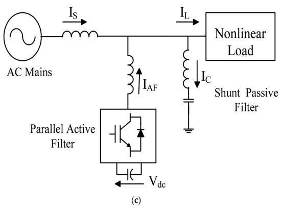 (a) Shunt APF, (b) series APF, and (c) hybrid APF [82].