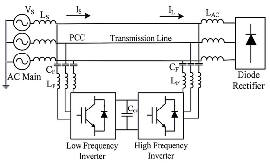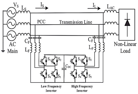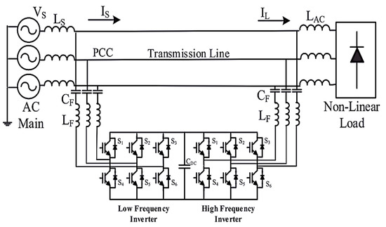 A double HAPF inverter topology, as shown in Figure 7, consists of two back-to-back power converters sharing a DC-link condenser. Switching operations make use of information and input management. Large condensers and high DC bus pressures are needed in high dynamic load systems in order to maintain a larger stability margin and reduce stress on any condenser. On the DC link condenser, a topology of the split condenser (B4) with a low cost and marginal voltage constraint is used [111]. The third component is connected to the split capacitor legs’ neutral mid-point, reducing the 12-switch power converter to an eight-switch power converter. The negative pole of the DC connection [112] is connected to the third level, which is ideally reduced in topology by a restriction of the split condenser topology. It improves process performance, reduces costs, and retains low voltage in the DC condenser even though the construction of hardware and controllers is very difficult. The LC PF was tuned to 550 Hz, after further testing, so that the lower-order harmonics were mitigated and a DC-link voltage was maintained. With a frequency of 750 kHz, the LC PF is tuned to high-degree harmonics. Both orders deal with harmonic mitigation in a complex and cogent manner. In each bridge inverter, a dual, four-button reduced count is suggested, as opposed to the standard twelve-button double-bridge inverter [113]. Load balancing and frequency exchange are done with and without redundancy in the two filters to maximize harmonic compensation and keep the grid stable. Separate DC condensers or transformers are used to block the zero-series current that circulates between the inverters. To connect three or two-leg series-parallel power translators, the line-interactive topology [114] is used. The three-phase, unidirectional, seven-phase resonance inverter is linked to three other command-line switches to achieve bidirectional power flow [115]. The neutral terminal is connected with the negative end of the DC condenser during a three-phase APF (four wires) [116]. The proposed UPQC architecture with neutral clusters reduces source current, the number of modules, DC-link voltage, switching frequency, and THD. To control each limb independently, shunt and series inverters require a capacitor-voltage balance, which increases the size and cost of the system. The system can be kept as compact as possible with a three-stage voltage regulator, synchronized compensation devices, and a T-connected transformer (Scott-Transformer) [117]. The DC-link voltage of the APF device is regulated by a normal condenser and the inductor by additional condensers in order.