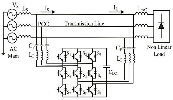 The topology of the inverter in three phases is presented in Figure 7. Both inverters are reverse-linked to the common DC-link condenser. Its key benefit is that it enhances the capacity of the APF to compensate.