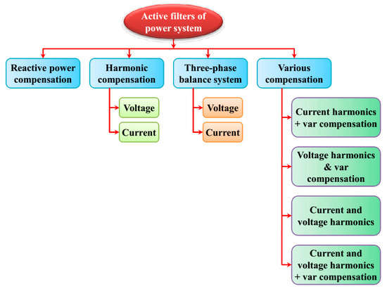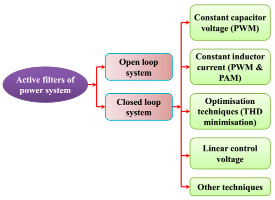 Active filters have been designed to improve certain power system features. These characteristics lead to the divisions described in Figure 8 that are included in the following section of the controlled system parameters.