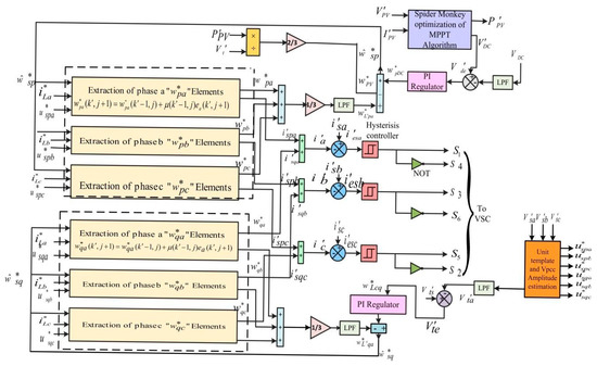 The main goal of installing a PCC (point of common coupling) [45] is to improve the operation and efficiency of power delivery systems. In interactive PV grid topologies, it is common to pair a PV inverter with an SAPF (active power filter) [46] and a voltage and reactive control superstation in order to prevent the costs of the power circuit from rising too high. The PV inverter converts the electricity produced by the solar photovoltaic device into usable electricity, while also filtering the harmonics of the load current [47,48,49]. Integrating an APF into the grid-connected PV system enhances its performance, reliability, and reduces current harmonic distortions [50,51,52,53,54,55,56].