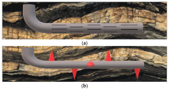 Slotted liner and perforated completions are two commonly used techniques for completing horizontal wells, which, as shown in Figure 1, serve as the primary interface between the injection formation and the wellbore [22]. The selection of the completion method and corresponding parameters plays a crucial role in determining gas storage performance [23,24]. Models that evaluate the performance of completion types for horizontal wells are useful tools for analyzing gas injection ability. Directed numerical models, such as computational fluid dynamics (CFD), provide an accurate simulation of fluid flow near the horizontal well [25]. However, CFD models require significant computational resources to simulate fluid flow around a full-scale horizontal well. For example, numerical studies of perforations around the wellbore typically impose a limit on the number of perforations (usually <20) to prevent excessive grid density [26,27,28]. Nevertheless, the insights gained from CFD simulations are valuable for developing analytical skin-factor models [29]. The skin factor is a critical factor that links completion design parameters and horizontal well storage capacity. It is composed of three main components: the decrease in permeability around the wellbore due to drilling fluids (formation damage) [30], the limited open area due to the completion method [31], and the turbulence effect [32,33]. In addition, the permeability in the vicinity of the perforation hole can also be reduced because a compaction zone is formed around the hole during the perforation [34].