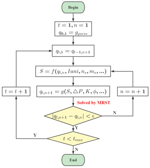 At the beginning of the initial time step (t = 1), it is first necessary to enter a hypothetical flow rate qguess and further use Equations (6)–(9) to determine the value of S. Then an updated flow rate q1,1 is calculated and used to calculate the next S in the next iteration step until the difference between the q1,n+1 and the q1,n calculated in the previous iteration is within an acceptable range, wherein the q1,n+1 calculated in the current iteration is used as the determined q at that time step. When the time step is larger than 2, the qt−1,n+1, the determined q at the previous time step, is used as qguess.