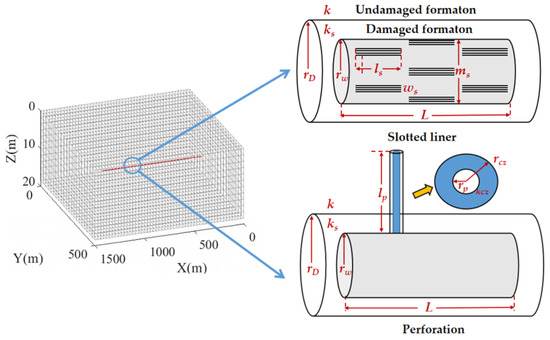 where kh is the product of effective permeability and net thickness in D·m, rw is the horizontal well radius in m, and re is the equivalent radius in m. The dimensionless parameter θ varies with the coupling relationship between the wellbore matrix. S is the skin factor, which is dimensionless. For a slotted liner, the skin factor can be expressed as [29]: