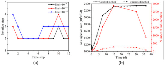 (a) The number of convergence steps required in the first 12 time steps for different convergence conditions (b) The gas injection rate and number of sub-iteration calculated by coupled and uncoupled method.