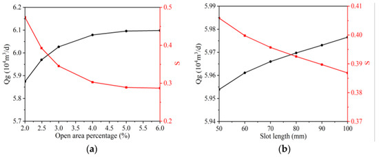 The gas injection rate of a horizontal well is influenced by its inherent design parameters, particularly when the formation experiences minimal drilling fluid damage and the gas injection rate is low. The formation damage caused by the drilling fluid is ignored in this sector. In addition, turbulence’s effect is minor because of a relatively low reservoir gas flow rate. Figure 6 shows the impacts of open area percentage, slot length, slot width, and slot angular distribution. The open area As is a key parameter that directly influences the gas injection ability of a horizontal well. A higher open area percentage of the slot liner typically translates to a larger flow area for the gas to enter the wellbore, resulting in the decrease of skin factor and the increase of gas rate. However, when the open area percentage increases from 5% to 6%, this increase in gas rate is only 24.4 m3, indicating a small effect on the increase in capacity when the open area percentage is large. Although a larger slot density leads to stronger gas injection capacity, it also results in lower wellbore strength, indicating that the open area needs to be controlled according to the mechanical strength of the tube [56]. The commonly used open area percentage of slotted liners generally ranges from 2% to 3%, with the maximum value not exceeding 10% [57,58].