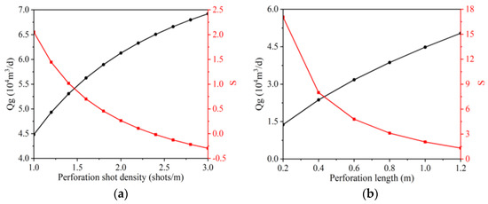 The gas flow rate of perforation and the skin factor at surface conditions. (a) Perforation density. (b) Perforation length. (c) Perforation radius. (d) Perforation orientation.