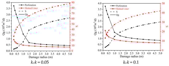 The gas flow rate of the perforation and the slotted liner completions and the skin factor at surface conditions under different ks/k and damage radii.