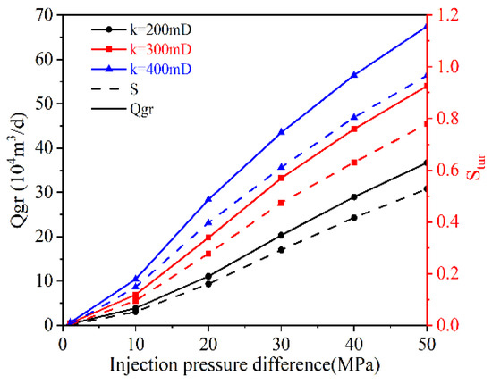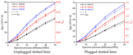 It is at higher reservoir permeability and larger injection fractures that the skin factor resulting from the turbulence effect is numerically close to the other skin factors. Therefore, in this section, the reservoir permeability is discussed in the range of 200–400 mD. When the pressure injection pressure is kept constant, the gas injection rate increases with the increase of permeability, as shown in Figure 9. The increase in gas injection rate caused a consequent rise in turbulence damage sfo, and in the unplugged slotted liner, the increase in skin factor ranged from 1.83 to 2.82 times as k increased from 200 mD to 400 mD. Similarly, the increase in injected gas volume due to the increase in injection pressure further leads to the increase in turbulence damage. Therefore, the relationship between pressure and gas injection rate is no longer linear as described in Darcy’s law, but the increasing value of the gas injection rate decreases with increasing pressure. The above nonlinear relationship is more obvious when the formation permeability and the gas injection pressure are large.