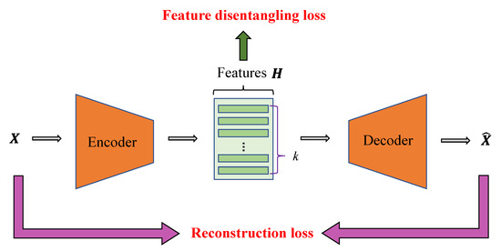 The conceptual structure of the DAE network. It consists of an encoder and a decoder module. The loss function of DAE is composed of a feature disentangling loss and a reconstruction loss, which aims to realize the capability of feature disentangling and reconstruction at the same time.