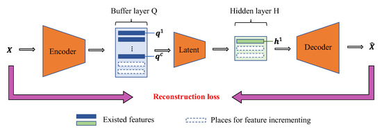 The structure of the IDAE network is shown in Figure 2. Between the input and output, there exists a hidden layer H and a buffer layer Q with multiple sublayers inside. The thin green and blue bars represent the existing feature vectors in layer H and layer Q, respectively. Additionally, the hidden layer H stands for the latent space that we discussed in this paper, the features inside are regarded as the latent space features. Instead of fixing the feature dimension before training and generating all the features at one time as in the DAE model in Figure 1, both layer Q and layer H in the IDAE network are designed to allow for feature increments. The thin white bars with a dotted outline in Figure 2 represent the places for feature increments. In addition to Encoder and Decoder modules, here, we name the neural network between layer Q and layer H as the Latent module. In other words, the output of layer Q can be mapped into layer H through the Latent module.
