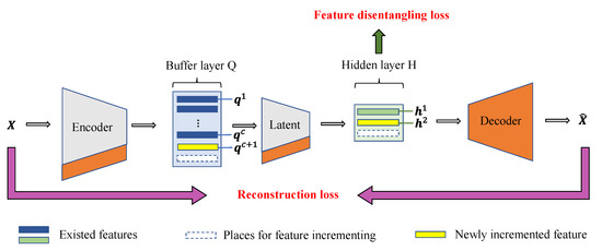 Here, we define a metric to describe the degree of latent space feature disentangling of the IDAE network and set the corresponding threshold . If the model shows after generating the second feature , this means and are still correlated to a relatively large extent. Then, we need to apply feature increments in buffer layer Q to help introduce more information from the input space to layer H, making it easier to realize feature disentangling. We add one extra feature to layer Q, which is shown as the left yellow bar in Figure 5. After the increment operation, we need to combine with the former feature matrix Q to obtain and retrain the IDAE network again to regenerate the feature . Meanwhile, we still expect the feature to be unaffected. The update operations for model parameters are summarized as follows.