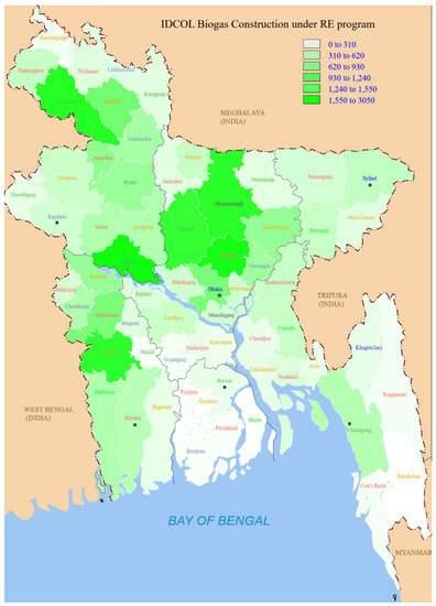 Around 80% of Bangladesh’s population relies on solid fuel for their household cooking and heating needs. Products from the incomplete combustion of firewood cause indoor air pollution and increase the propensity to diseases, such as pneumonia and other acute lower respiratory infections and chronic obstructive pulmonary diseases [26]. Coal and kerosene are two commercial fossil fuels that are the most common fuels used for cooking, contributing to climate change, and are expensive to use [27,28]. If biogas is generated and produced from biomass resources, such as dung, then the heating efficiency is about 60% [29,30]. In comparison, burning a ton of straw in traditional burners will reportedly produce 3 kg of particulate matter, 60 kg of carbon monoxide, 1460 kg of carbon dioxide, 199 kg of dust, and 2 kg of sulfur dioxide [31,32]. These gases play an important role in affecting the atmosphere and environment, which leads to global climate change [32]. In particular, the elements can also easily invade the lungs causing respiratory disease, especially for children and patients with asthma. Additionally, incomplete combustion produces carbon monoxide and carcinogenic hydrocarbons, which could cause cancer [33].