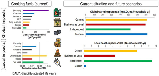 A comparison of current and future cooking fuel use has been compared and is shown in Figure 5 the comparison of their impact in terms of global warming potential (GWP) and health impact.