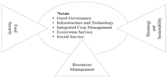 Aspects that need to be considered when assessing the sustainability of a bioenergy project are land use, land use change, greenhouse gases, biodiversity, air quality, productivity, social well-being, energy security, trade, profitability, resource conservation, and social acceptability [39,40]. Resource management practices are more important than crop type in determining environmental impacts [41]. Wise management of available resources supports both bioenergy sustainability and food security [42]. An analysis of interactions among resource management, bioenergy sustainability, and food security is discussed first in terms of paired interactions, followed by a consideration of a three-way nexus. A sustainability impact assessment suggests that there is a viable impact on waste management, food security (from the generation of compost), and bioenergy sustainability. This nexus requires good governance, effective infrastructure, reliable technology, integrated crop management, effective ecosystem services, and social services (Figure 8).