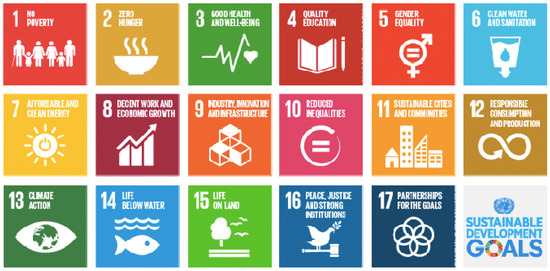 After the completion of the Millennium Development Goals (MDGs), the ‘Sustainable Development Goals’ (SDGs) were defined by the United Nations Conference on Sustainable Development in 2015 and included the planet, the people, sustainable energy, economy, justice, equity, and partnership. Leaders from 193 countries solidly adopted the post-2015 agenda for international development for the period of 2015–2030. There are 17 goals (shown in Figure 8) that have 169 targets. These SDGs are characterised by an agenda including ending poverty and eliminating its root causes, tackling the adverse effects of climate change, fighting disparity, and ensuring a sustainable future for all [43]. The ultimate goals of SDGs help achieve environmental sustainability, which helps to improve the future lives of citizens. It helps to deal with the impacts of climate change, eliminate poverty through attaining gender equality and improved health and construct an inclusive society, which will help to reduce disparities and help economic progress [43].
