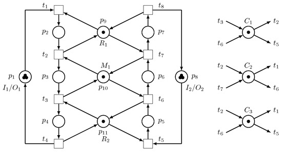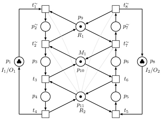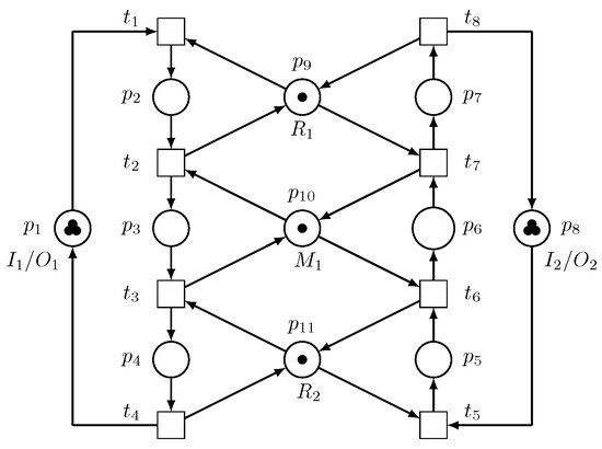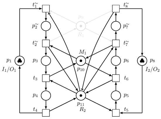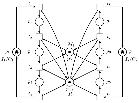 The Petri net model of the robotic manufacturing cell is depicted in Figure 2. Since is an unreliable resource, designing only a deadlock controller for the system cannot guarantee a continued processing of parts by the manufacturing cell if fails. To increase the system’s reliability and improve the system performance, we propose the utilization of another robot that is reliable, or at least more reliable than , which can perform the same task as to reduce the amount of tasks performed by , and can perform all the tasks being performed by if fails.