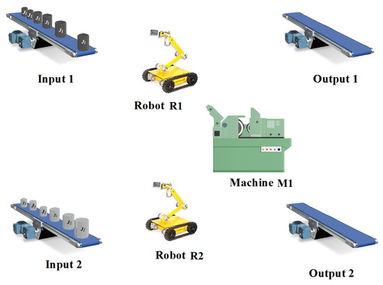 Consider the system in Figure 1. It is a fact that when fails, all the processes in the system stop. If a robot that is reliable is introduced as an LSRE, both and can actively load and unload parts to/from , and if fails, can step up and take over performing the tasks of loading and unloading the parts until is repaired. This fact is depicted in Figure 3 and the Petri net model of the manufacturing cell is visualized in Figure 4. The production sequence of the new robotic manufacturing cell becomes: