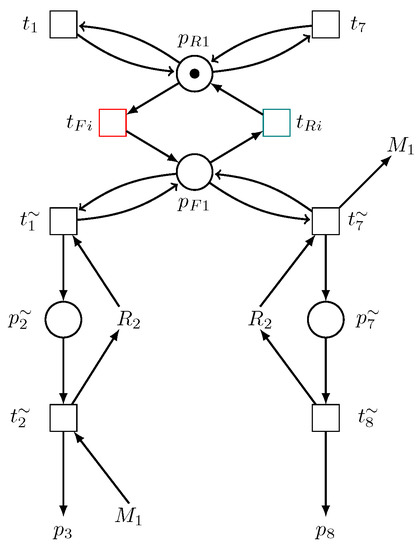 Let be a marked SPR of an AMS with an unreliable resource denoted by and a set of resources , where is the set of reliable resources. An SPR net model of an AMS with an unreliable target resource is an unreliable SPR net model denoted by USPR.