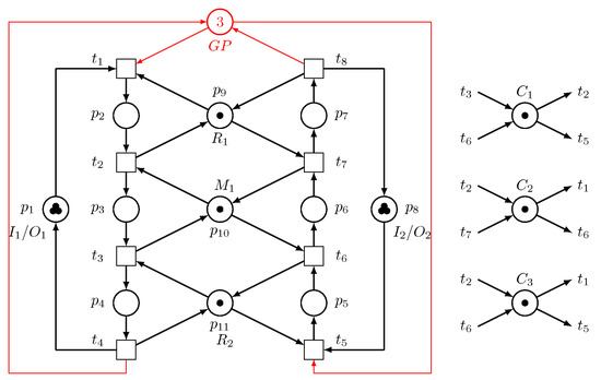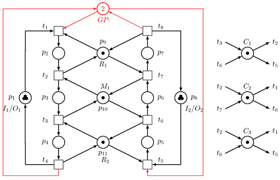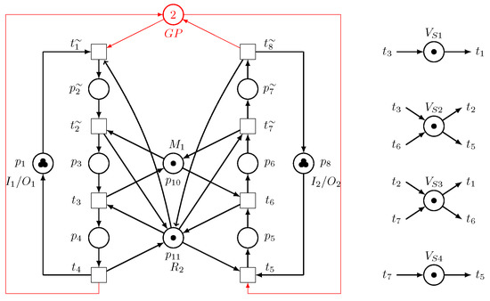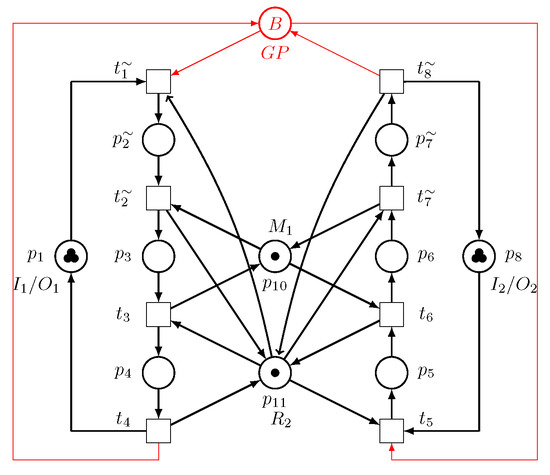 - Step 2: For sink/source places and , we have , , , and . We have and . By including the GP, a novel net structure is found, as illustrated in Figure 9.