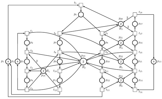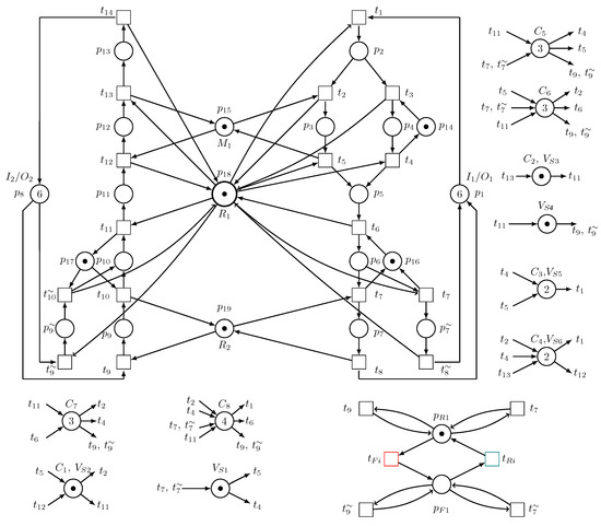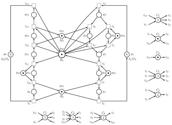 Consider a robotic manufacturing cell [57] containing six robots, – ( introduced as an LSRE and an unreliable robot), and the SR Petri net model of the manufacturing cell is visualized in Figure 23, where , , , , , and .
