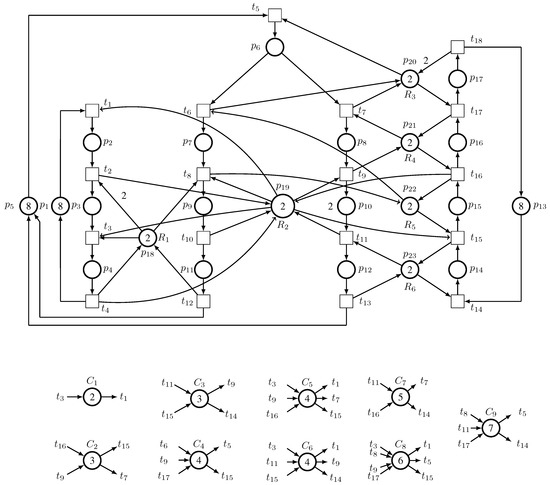 - Al-Shayea, A.; Kaid, H.; Al-Ahmari, A.; Nasr, E.A.; Kamrani, A.K.; Mahmoud, H.A. Colored resource-oriented Petri nets for deadlock control and reliability design of automated manufacturing systems. IEEE Access 2020, 9, 125616–125627. [Google Scholar] [CrossRef]