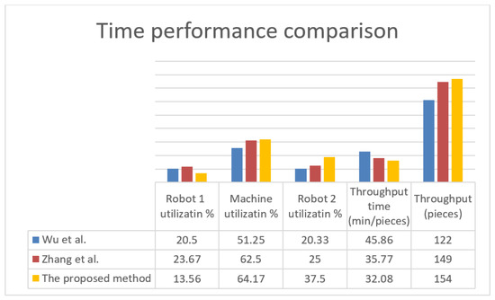 The proposed method was compared with the methods by Wu et al. [59] and Zhang et al. [60] for its testing and validation. In the simulation, we considered failures that happened to the target elements after a period of operation for the system over different time periods. We obtained the results as summarized in Table 9 after running and simulating the Petri net model using TINA tools, which illustrated a comparison of the performance of the proposed method and that of other methods in the literature. Figure 27 depicts the results in terms of machine and robot utilization, the throughput of parts and , work-in-process, and total time in the system (throughput time). In terms of throughput, the productivity of other techniques was less than that of the proposed method. The proposed method achieved better results than the other techniques in terms of work-in-process. In terms of throughput time for parts and , the proposed method achieved a lower overall throughput time than other techniques. As a result, the proposed method is valid, can produce adequate results, and can potentially be applied to other cases.