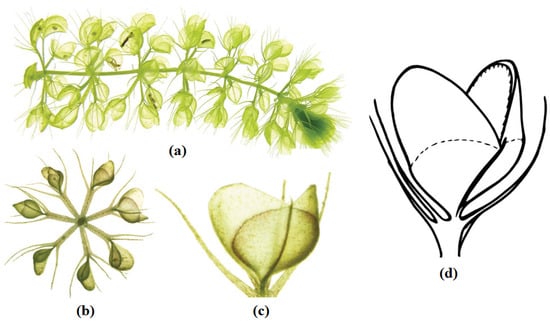 Image of the waterwheel plant []. (a) Lateral view of a free-floating shoot with numerous traps. (b) Frontal view with open and closed traps. (c) Single open trap. (d) Schematic drawing of an open trap.
