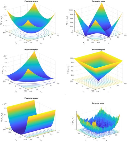 This work employed 23 benchmark test functions widely used in optimization algorithms. Unimodal benchmark functions F1 to F7 were included in the conducted experiments. Benchmark functions F8 to F13 were part of the multimodal set, whereas F14 to F23 were part of the multimodal set fixed in dimensions. Table 1, Table 2 and Table 3 provide a summary of the test functions and their corresponding parameters. In these tables, D and refer to the number of dimensions and the mathematical function, respectively. shows the interval of the search space, and refers to the optimal value that the corresponding functions can achieve. Figure 3 displays the illustrative 3D models of typical functions included in the comparison results.