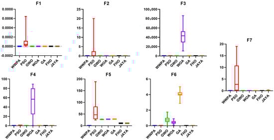 The population size was 50, and the number of iterations was 500 to solve the benchmark test functions. Algorithms such as Particle Swarm Optimization (PSO) [], Genetic Algorithm (GA) [], Differential Evolution (DE) [], Whale Optimization Algorithm (WOA) [], Grey Wolf Optimization (GWO) [], JAYA algorithm [], and the Fire Hawk Optimizer (FHO) algorithm [] were contrasted with the proposed optimization algorithm. Table 4 displays the sources from which these algorithms were derived. Table 5 displays the algorithms’ parameter settings that were employed in the performance comparisons.