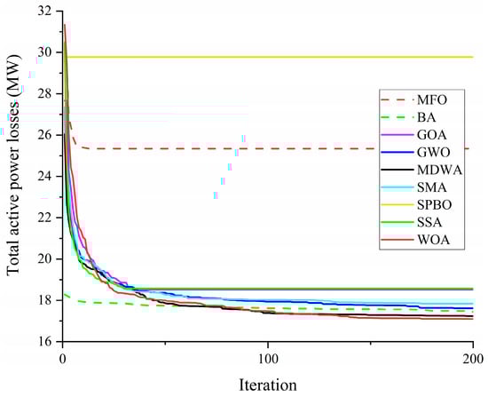 The WOA performs shrinkage encircling, bubble-net attacking and random searching to discover a suitable solution [31]. The WOA has some advantages for resolving the ORPD, such as simple implementation, small storage space, a fast convergence rate and great computation precision, which equalizes exploitation and exploration to disrupt premature convergence and identify superior convergence accuracy. The WOA is superior to MFO, BA, GOA, GWO, MDWA, SMA, SPBO and SSA; the WOA has remarkable sustainability and robustness.