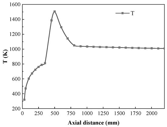 Figure 2 presents a curve illustrating how the temperature changes in the central axis of the furnace chamber. It reveals that the temperature in the furnace rises slowly from the furnace inlet to the axial distance of 350 mm. This area is mainly heated by pulverised coal and fresh air brought in by the primary and secondary air inlets in the furnace. Between an axial distance of 350 mm and 500 mm, the temperature climbs sharply at the centre line of the furnace chamber and the temperature gradient changes significantly. The combustion reaction primarily occurs in this region, where the volatile fraction and the coke burn quickly to release a large amount of heat. The highest temperature occurs near Z = 500 mm with a peak of 1504 K. After the combustion reaction is complete, the temperature drops rapidly to approximately 1050 K. Subsequently, the variation in temperature decreases and the temperature drops slowly to around 1000 K. The homogeneous reaction between the gas phases mainly occurs in the reduction zone, which is downstream of the furnace chamber. Therefore, the reaction heat release is low, and the temperature change is small.