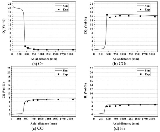 To verify the reliability of the numerical simulation method, the simulation results were compared with the experimental data from prior research [23]. A comparison of the simulated and experimental values of the concentrations of the main gas components is shown in Figure 3. In Figure 3, an observation can be made that the average error between the simulated and experimental values of the concentrations of O2, CO2, CO, and H2 was within 10%, and the error at the furnace exit was within 5%. Such results indicate that the simulation methods can accurately predict the coal combustion process and that the model can be used to predict the evolution of sulphur components.