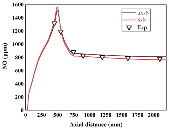 Figure 4 reveals how the concentration of NO varies on the centre line of the furnace chamber under uS-N and S-N conditions. It also shows a comparison with the experimental values. The figure indicates that the trend of the changing concentration for NO on the central axis is very similar under both operating conditions. Initially, the NO concentration increases due to pyrolysis of the nitrogen-containing material in the coal. As the temperature increases in the main combustion zone, the oxidation reaction rate of the nitrogen-containing components, such as HCN and NH3, to produce NO increases, leading to a rapid rise in the NO concentration. Next, as the O2 concentration falls, the furnace atmosphere transforms into a reducing atmosphere and the reduction of NO by reducing gases leads to a decrease in the concentration of NO. By comparing the average error between the simulated and experimental NO values under the two conditions, the average error under S–N conditions is 2.5% and 3.7% under uS-N conditions. This indicates that the model can accurately simulate the formation of NOX.