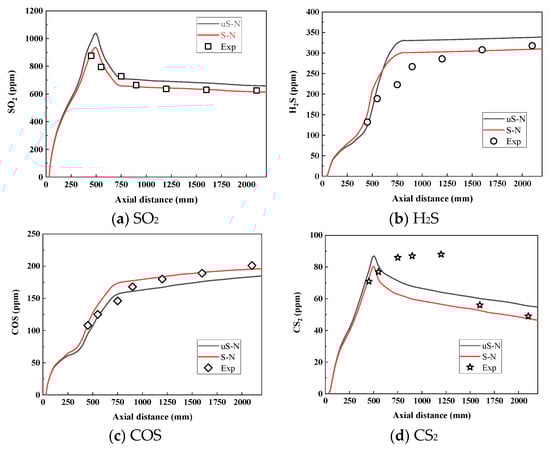 Comparing the average error between the simulated and experimental values under uS–N and S–N conditions, the average error of SO2 under S–N conditions was 3.2%, which was lower than 8.2% under uS–N conditions; the average error of H2S under S–N conditions was 13.5%, which was lower than 17.2% under uS–N; and the average error of COS under S–N conditions and uS–N conditions was 6.0%. The mean error of CS2 was 16.0% under S–N conditions, which was slightly higher than the mean error of 14.5% under uS-N conditions. As Figure 5d reveals, there is a local deviation between the simulated and experimental values of CS2 in the high-temperature region of the reduction zone in the furnace chamber. A possible explanation for this phenomenon is that the generated CS2 in the experiment is unevenly distributed in the furnace chamber and there is a certain error in the instrumental measurements of the experimental values. Additionally, the reactions in which CS2 is involved in this region are very complex. For instance, Clark et al. [27] and Abián et al. [28] showed that CS2 reacts with a variety of substances such as H2O, CO2, SO2, SO, H2, etc., in the high-temperature region of the reduction zone. The reaction mechanism here has not yet been determined, and simulations cannot fully reflect how the reaction proceeds. However, the average error between the simulated values and the experimental values of the models used for both S–N and uS–N conditions is generally around 15.2%. Therefore, more detailed experimental studies regarding CS2 should be conducted in the future. The mean error of CS2 was 16.0% in S–N, which was slightly higher than the mean error of 14.5% in uS–N. Comparing the errors between the simulated and experimental values at the furnace exit for uS–N and S–N conditions, the errors were 1.8% for SO2, 2.8% for H2S, 3.0% for COS, and 4.1% for CS2 for the S–N conditions, and 7.3% for SO2, 6.3% for H2S, 9.0% for COS, and 12.2% for CS2 for the uS–N conditions. The error of CS2 was 12.2%. An observation can be made that the prediction results of SO2, H2S, COS, and CS2 for the S–N condition were significantly better than those for the uS–N condition, thus indicating that the numerical model improved the accuracy of the prediction of the evolution of the sulphur components after considering sulphur–nitrogen interactions.