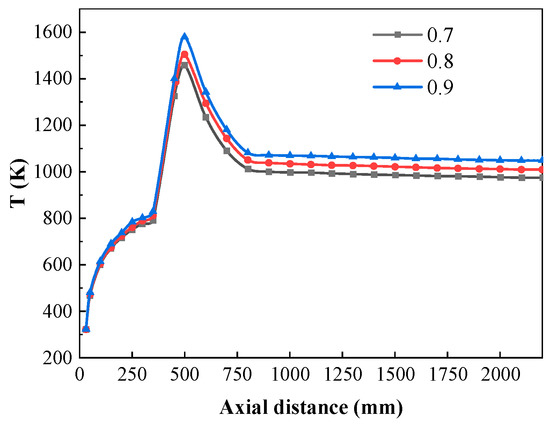 Temperature variation curve on the central axis of the furnace with different air excess coefficients.